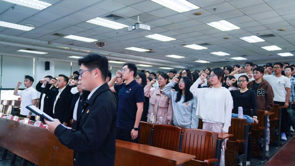 大会在庄严的重温入党誓词环节中拉开序幕。全体学生党员面向党旗,举起右拳,在领誓人的带领下郑重宣誓。铿锵有力的誓言回荡在会场,既是对初心使命的坚守,也是对责任担当的庄严承诺。