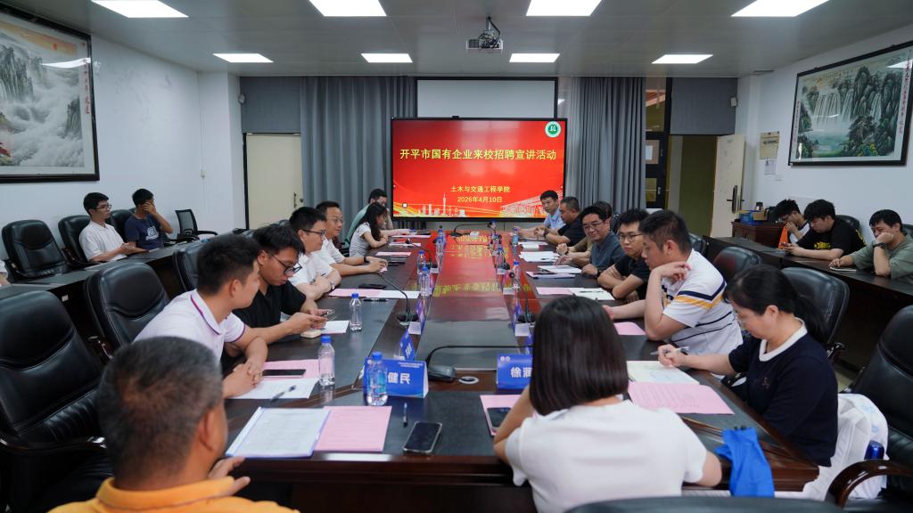 当日下午,开平市委组织部副部长周星明带领6家市属龙头国企参加招聘会,并与周建强、陈颂坚等师生一行开展座谈交流。双方围绕深化产教融合、培养高素质人才等主题深入探讨,就进一步完善院地对接机制、加强产学研合作和毕业生就业合作达成共识,共同推动院地合作走深走实。